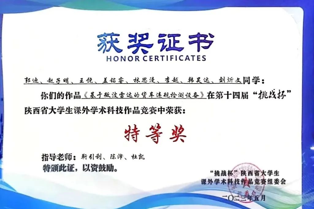 伟德国际1946源于英国积极响应团省委和校团委号召,广泛组织学生参与本届“挑战杯”竞赛。由学院靳引利教授指导、本科生郭迪、赵子明、王饶、盖铭睿、林思漫、李越、韩昊达、刘炘文同学完成的作品《基于微波雷达的货车违规检测设备》荣获第十四届“挑战杯”陕西省大学生课外学术科技作品竞赛特等奖,实现了学院在此项赛事上的历史性突破,团队成员赵子明同学代表学校在颁奖仪式现场进行路演展示。