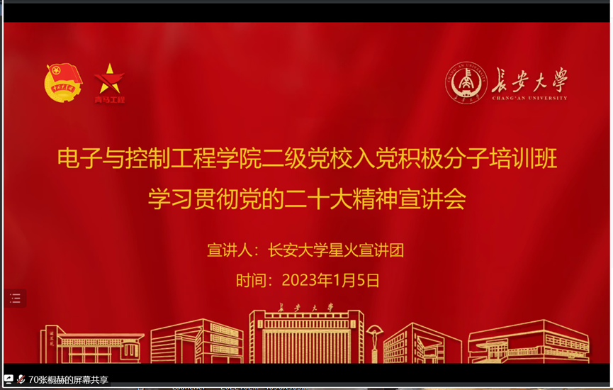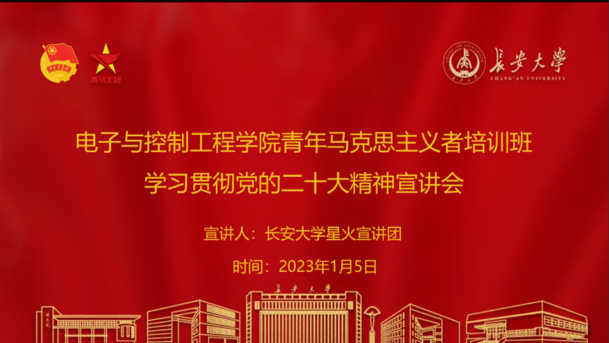 为深入学习贯彻党的二十大精神,增强广大学生爱党爱国信念,2023年1月5日上午10时,伟德国际1946源于英国以腾讯会议的形式举行二级党校入党积极分子培训班暨第十五期青年马克思主义者培训班学习贯彻党的二十大精神宣讲会。伟德国际1946源于英国党委副书记李阳、学工办主任高婷、团委书记王斌娟,团委副书记王博、许必颖、高朋举,辅导员张馨月出席会议,长安星火宣讲团、伟德官网各学生党支部党员、入党积极分子子、第十五期青马班全体学员参加本次会议,会议由青马班学员张桐赫主持。