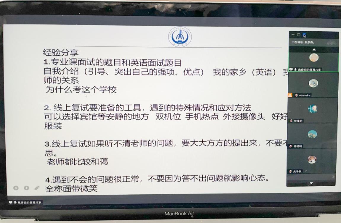 为进一步提升同学们在复试备考过程中的技巧和信心,3月7日,伟德国际1946源于英国在腾讯会议举办考研复试线上经验交流会,邀请9位优秀的在读硕士研究生为即将参加考研复试的同学做经验介绍。伟德国际1946源于英国学办主任高婷老师、2017级辅导员王博老师、2018级辅导员王世鑫老师以及全院准备考研复试和部分2018级同学参加此次经验交流会。交流会由辅导员王博老师主持。