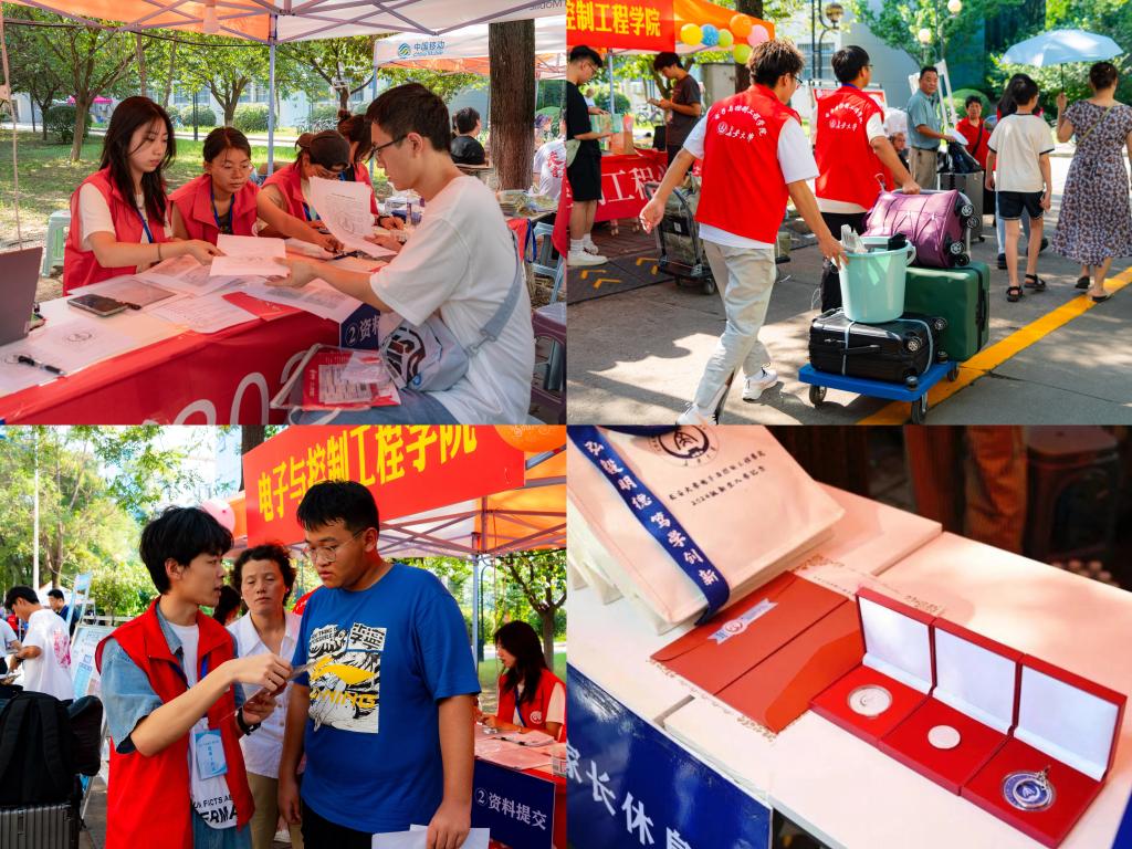 学院迎新志愿者们热情迎接每一位新同学,为新生解答疑问、指引路线、搬运行李,帮助新生顺利入住宿舍,完成报到流程。学院还为新生准备了专属大礼包,有定制帆布包、纪念钥匙扣、纪念币、纪念徽章和致新生的一封信等,包含了电控大家庭对新生们满满的爱与关怀。