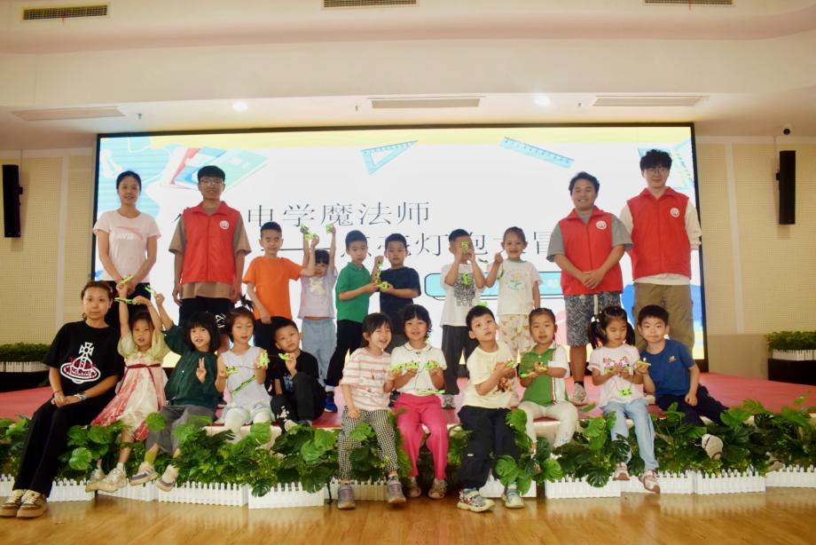 分发电路元件后,志愿者们逐步讲解搭建电路的要点及注意事项,并带领孩子们先后完成了串、并联电路的搭建。当孩子们自主连接电池、导线与开关,亲眼见证手中的灯泡渐次亮起时,他们或高举作品向同伴展示,或专注调整线路探究明灭规律,跃动的光斑映照着充满求知欲的眼眸。