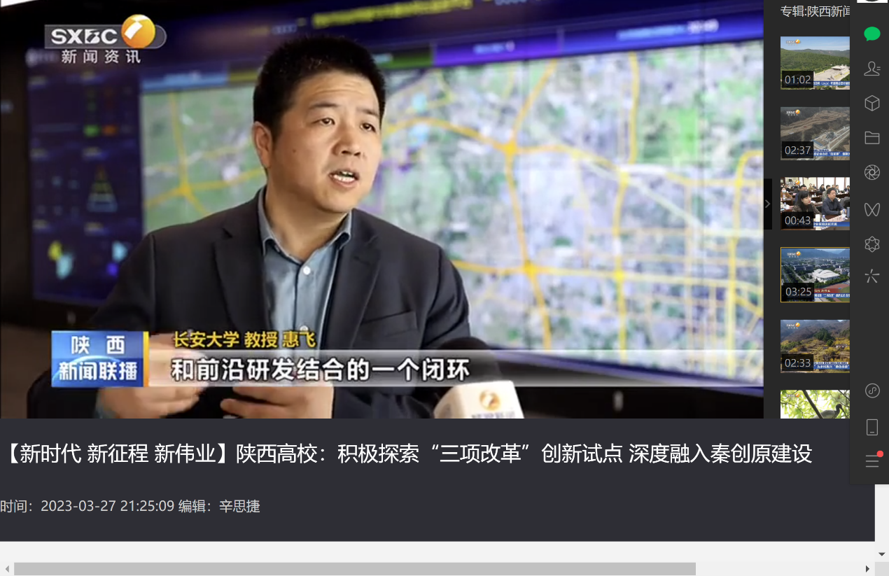 3月27日,《陕西新闻联播》以“【新时代 新征程 新伟业】陕西高校:积极探索“三项改革”创新试点 深度融入秦创原建设“为题报道了我省高校积极探索“三项改革”创新试点情况,其中报道了我校结合学校优势学科资源和陕西省“三项改革”大背景,立足技术转移的市场需求,加速推动智能网联汽车测试团队依托秦创原平台进行科技成果转化。