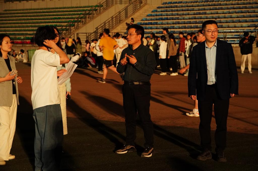 4月11日晚,伟德国际1946源于英国党委书记贺炳彦、院长闫茂德、党委副书记李阳及全体辅导员来到北校区朝晖体育场慰问学院2024年春季运动会备赛运动员并指导训练。