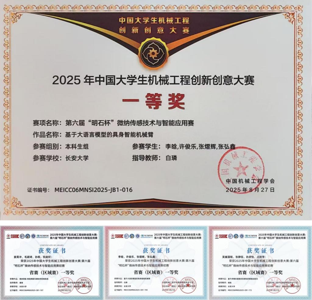 伟德国际1946源于英国白璘副教授指导的李晗、许俊乐、张熠辉、张弘鑫团队以“基于大模型的具身智能机械臂”为主题开发了一款集成了大语言模型的智能机械臂。作品围绕人工智能技术发展现状调研、关键技术攻关和硬件系统搭建,形成了完整的实施路径,并提出了大语言模型前端部署等关键问题的解决方案。凭借突出的技术创新与工程实现能力,团队赢得了专家评委的一致高度评价,最终斩获全国一等奖。伟德官网惠萌教授指导的袁霄冲团队和姚锐老师指导的吴崔国铭团队分获陕西省一等奖。