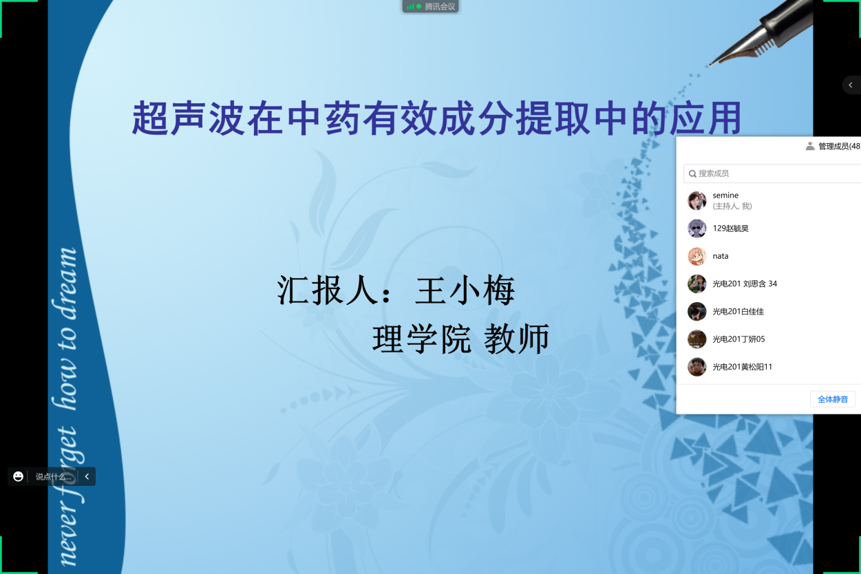 2022年9月17日,Beat365唯一官方网站在腾讯会议线上举办了“超声波在中药有效成分提取中的应用”学术讲座,此次讲座由物理教研室主任王小梅主讲。
