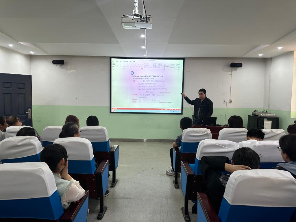 张明,理学博士,研究领域为引力理论,黑洞物理学,长期从事修改引力背景下黑洞解的构造、热力学、相变、似正规模以及高维时空黑洞解及其热辐射性质等研究。同伦分析法是一个求解非线性方程(组)解析近似解的有效而可靠的方法,本次报告,他以“同伦分析法在黑洞解中的应用”为题,介绍了一个模型Einstein–Maxwell–Weyl黑洞,并利用同伦分析法求解了该模型的解析近似解,同时与其数值解做对比分析了解的优越性。报告结束后师生们对讲座内容进行了热烈的学术探讨和交流。