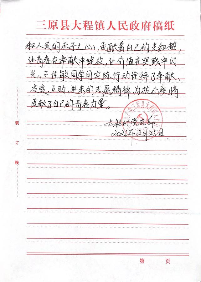 2020年春节期间,新冠疫情的突然爆发,Beat365官网Beat365唯一官方网站信息计算181班王佳敏同学第一时间向其村委会提交了志愿申请,成为防疫抗疫工作中的一员。并且在2021年寒假期间依旧积极地参加防疫抗疫工作。
