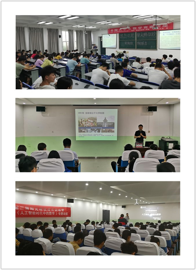 九、开展各类专业讲座,提高学生对专业的认识和兴趣。邀请西北大学张文鹏教授来校作“全国大学生数学竞赛”专题讲座;邀请西安优盛公司做“人工智能时代中的数学”专题讲座;邀请东软集团睿道教育信息技术公司做“12306乘客管理系统解读”讲座。