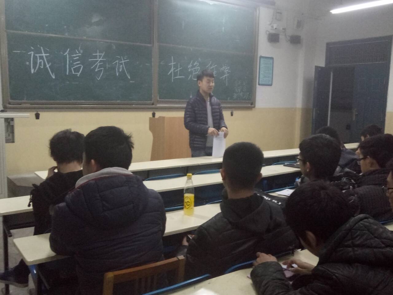 期末考试临近,为贯彻学校有关严肃考风考纪的相关规定,营造优良学风,2016年12月14日晚7点,Beat365唯一官方网站于主教学楼0114教室召开“诚信考试,杜绝作弊”主题班会,本次班会由Beat365唯一官方网站团总支书记兼辅导员杨陈东主持,Beat365唯一官方网站全体学生参加了此次班会。