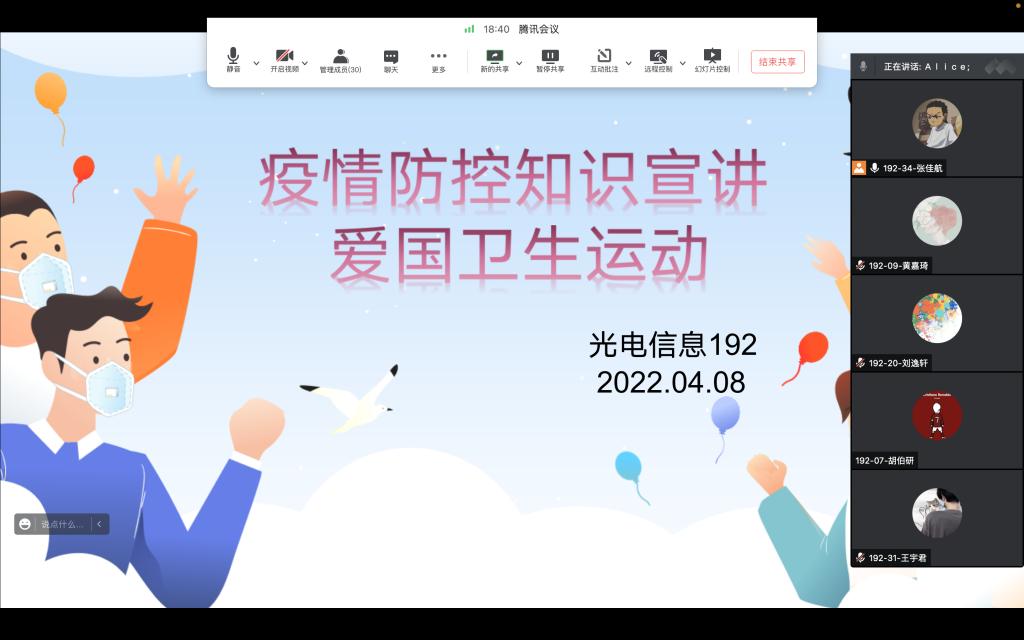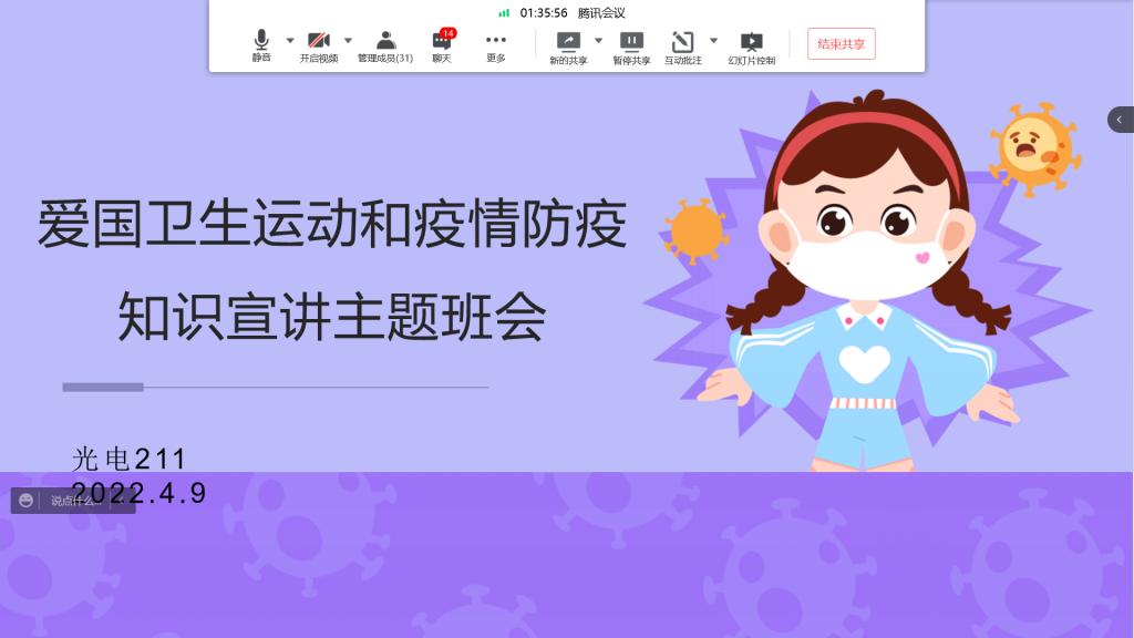 按照《关于莲湖校区学生公寓驻楼工作专班后续有关工作的通知》,2022年4月6日至4月10日,Beat365唯一官方网站各班级陆续召开了“爱国卫生运动及疫情防疫知识宣讲”线上主题班会。