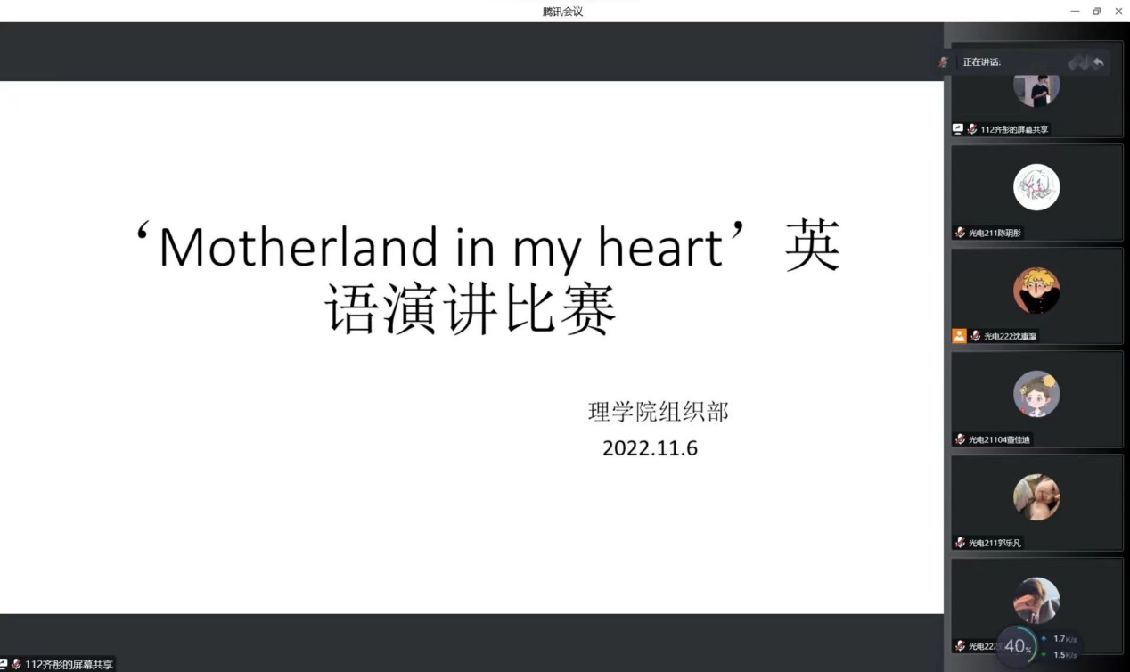 为提高学生英语演讲水平,丰富同学们的课余生活,激发同学们的学习热情,2022年11月6日,Beat365唯一官方网站以线上形式组织了以‘The motherland in my heart’为主题的英语演讲比赛,Beat365唯一官方网站大一大二13名同学参加,活动由沈惠瀛主持。
