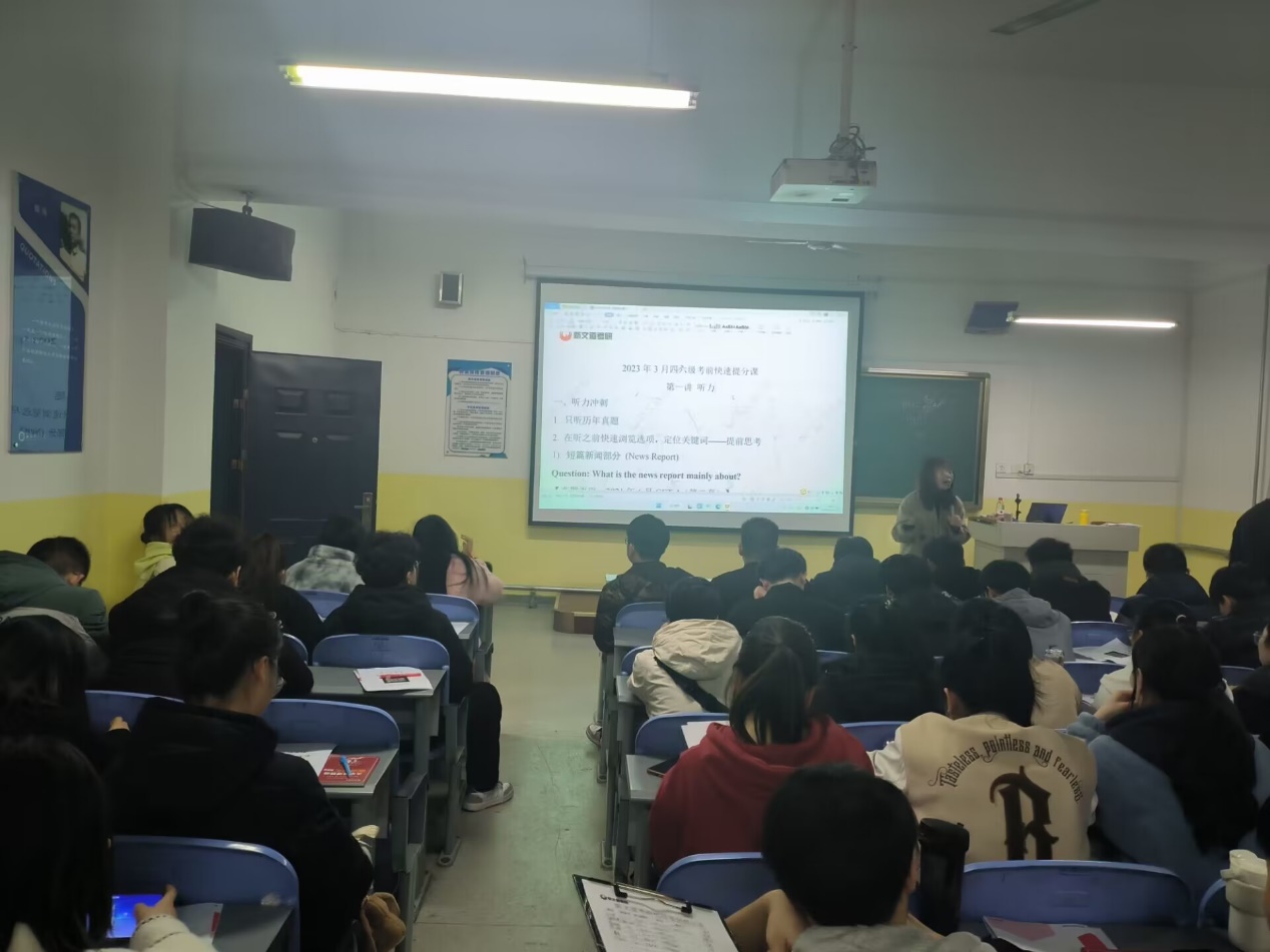 为加强学生对英语四六级题型的了解,提高考生考试水平,稳固考生对于通过考试的信心,2月28日晚七点,Beat365唯一官方网站在南楼233举办了四六级英语考前技巧指导课。课程特邀新文道考研李洁老师为考生传授考试经验和考试技巧。