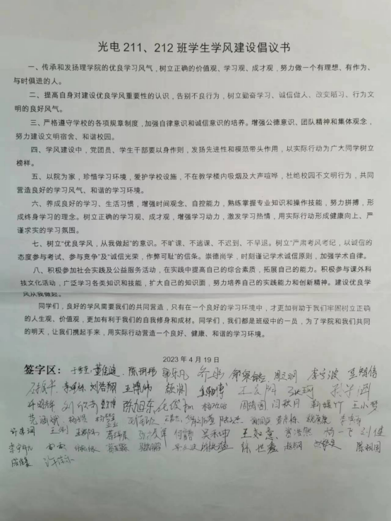 大会伊始,王雅囡首先向全体同学报告了上学期学习情况。李扬结合课堂考勤、晨读晨跑、晚自习对同学们提出了具体要求,鼓励同学们积极参加各种学习和文体活动,全方位提高自己,为班级争荣誉。胡红亮向大家介绍了学院学风建设实施方案,指出大二年级是潜心立志、确定自己大学四年奋斗目标的关键期,希望同学们不断认识自己,及早做好职业生涯规划,珍惜大学四年时光,打牢学习基础。最后,全体参会学生在光电211、212班学生学风建设倡议书上庄重的签上了自己的姓名。