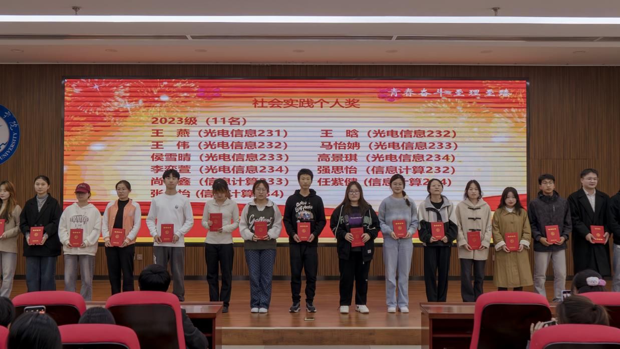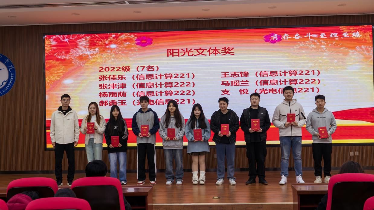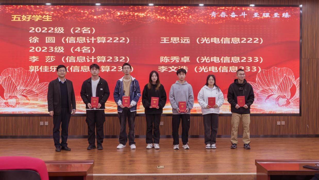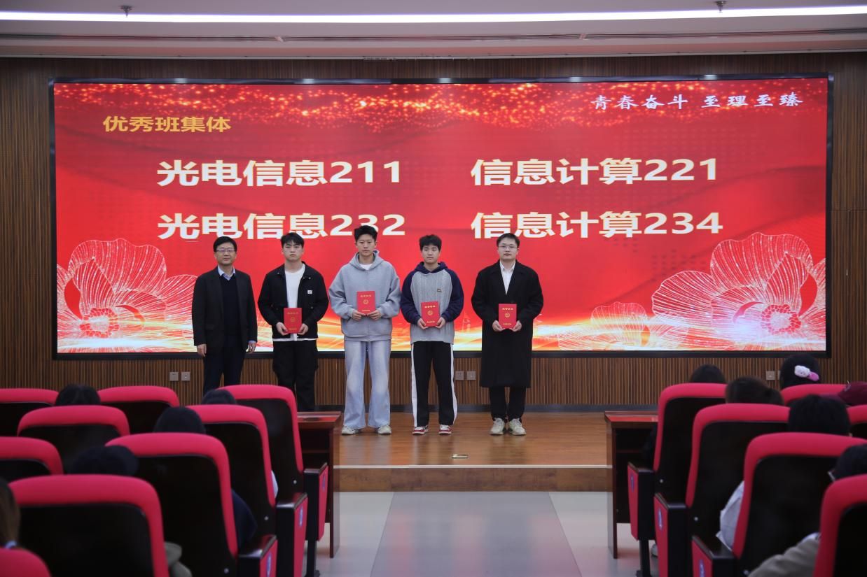 胡红亮,李扬,王向阳,张岩,曾妍依次为优秀班集体、五好学生标兵、五好学生、学业优秀奖、单科优胜奖、学业进步奖、社会实践优秀集体、劳动实践奖等获得者颁奖。随后优秀班集体(信息计算221张佳乐)、五好学生标兵(刘孔子)、活力文体队伍(羽毛球队王玉琛)、社会实践优秀先进个人(杜祎婷)分别作代表发言,表达了对学院培养的感激之情,分享了自己在学习,社会实践以及体育劳动方面的经验和心得,并表示自己将再接再厉,不断提高自我。