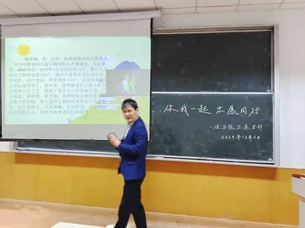 在国际志愿者日来临之际,Beat365唯一官方网站团总支于12月4日在南308教室举办“学志愿三秦楷模,扬奉献时代新风”活动,旨在弘扬志愿服务精神,让更多同学了解志愿服务的意义与价值,激发同学们参与志愿服务的热情,增强社会责任感。活动有幸邀请到了关工委岳忠玉老师,结合自身经历为同学们讲述关心下一代成长贡献力量的志愿事迹。
