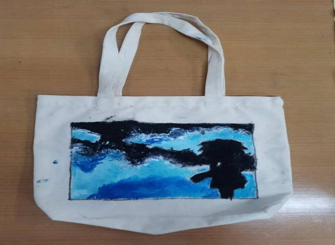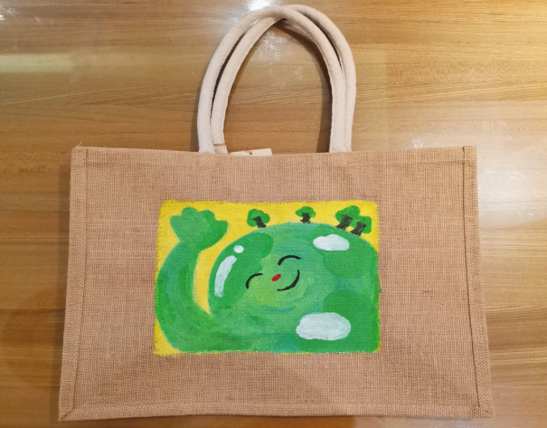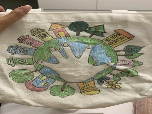活动过程中,大家以“地球家园”“绿色生活”为主题,用彩笔在空白布袋上绘制蓝天白云、青山绿水、可爱动植物等图案,将环保理念融入灵动的笔触中,积极参与环保布袋DIY创作,处处洋溢着环保与创意交织的活力。一个个独具创意的布袋相继诞生。光电243张之祺同学讲解自己的创作理念“自己绘画的海洋相关元素,是在强调海洋生态系统的丰富性和脆弱性,呼吁大家重视海洋生物多样性保护,减少对海洋的污染和破坏,共同守护绿色海洋家园。”