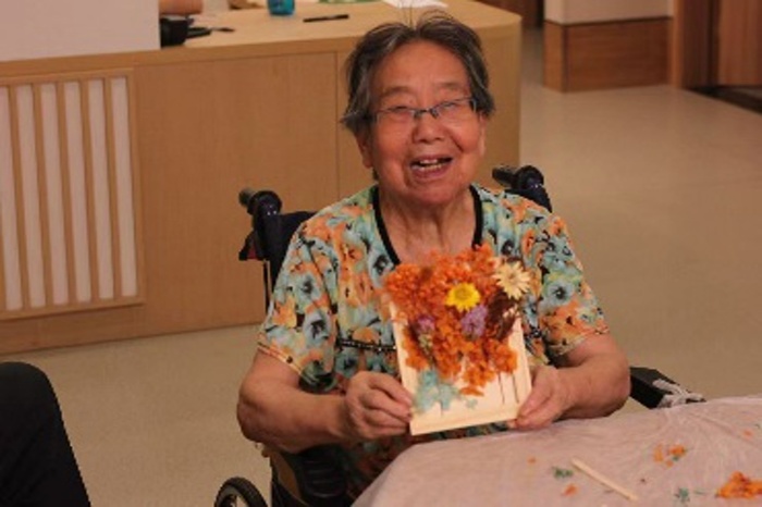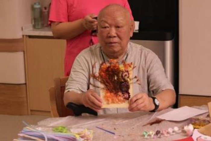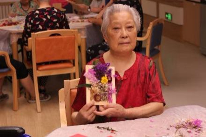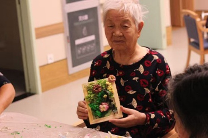 80岁的张爷爷在志愿者的协助下,精心挑选了粉色玫瑰和白色满天星进行创作。他小心翼翼地将花朵排列组合,最终完成了一幅满意的作品。“年轻时就很喜欢侍弄花草,没想到晚年还能学会制作这么雅致的干花相框!”张爷爷手捧自己的作品,脸上洋溢着自豪与喜悦的笑容。活动中,长者们充分发挥想象力与创造力,将各色干花巧妙组合,创作出一幅幅独具匠心的艺术作品。有的作品清新淡雅,有的则色彩明快、充满活力,每一幅都承载着长者们对美好生活的热爱与向往。