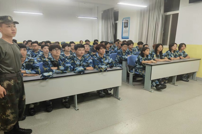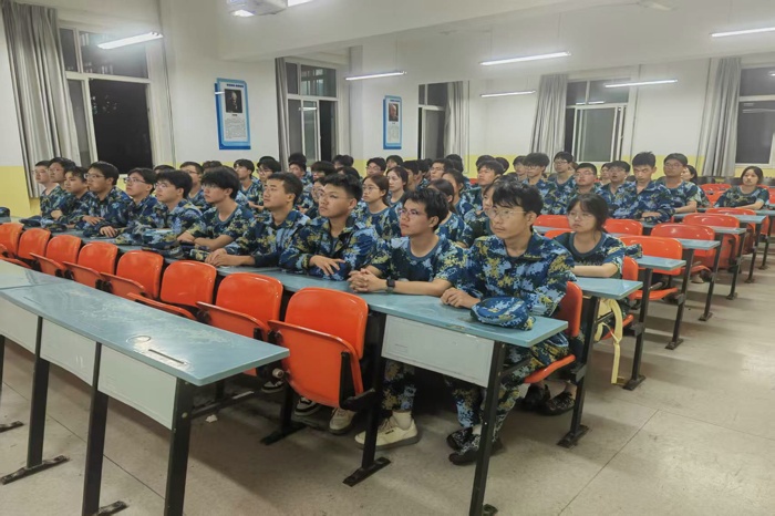 除了高强度的体能训练,学院还精心安排了多元军训活动。夜晚的“爱国电影课堂”中,新生们整齐端坐,身姿挺拔,安静专注地凝视银幕。整个教室肃穆无声,只有影片中的对白与旋律缓缓流淌。他们目光如炬,神情庄重,随着剧情推进时而凝神屏息,时而目光闪动;当国旗升起、英雄凯旋的画面出现,不少人不由自主地挺直脊背,眼中闪烁着坚定与敬仰。这堂没有讲台的“课”,以光影为笔、以故事为墨,让爱国情怀在沉浸式的体验中深深烙印,成为军训夜里一场深刻的精神洗礼。