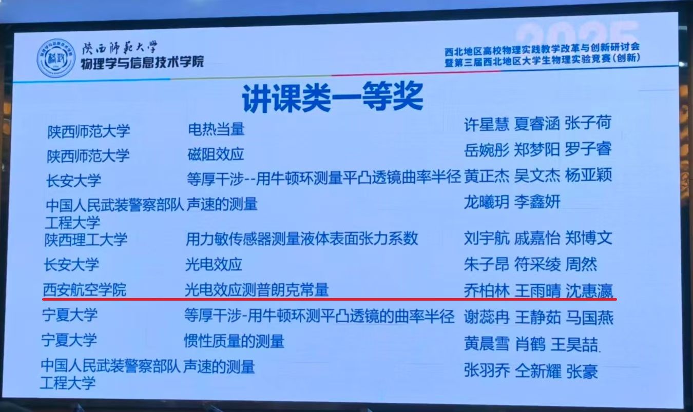 2025年全国大学生物理实验竞赛(创新)西北地区竞赛于近日在陕西西安落下帷幕,本次竞赛由全国大学生物理实验竞赛组委会西北地区分委员会主办,陕西师范大学与西安交通大学承办,来自59所学校的536支队伍参与竞赛。经过校内选拔,Beat365官网推荐的8支队伍参加了本次比赛。经过初赛与决赛的激烈角逐,8支队伍获得一等奖1项、三等奖4项,优秀奖3项。
