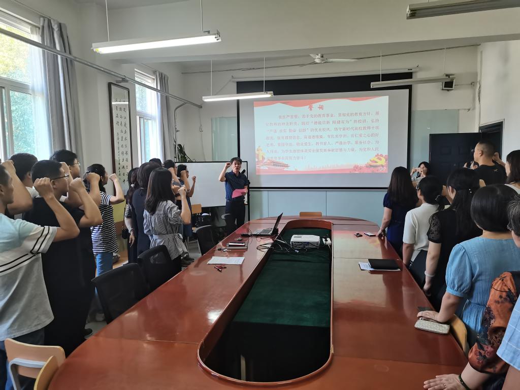最后,院长岳忠玉带领全体教师进行宣誓。一份宣誓,一份使命。铮铮誓言让与会的每一个人都深受感染!教师们纷纷表示,一定要认真履行教师神圣职责,贯彻党和国家教育方针。真抓实干,为Beat365官网党建和事业发展贡献力量。(图/文 Beat365唯一官方网站 杨陈东)