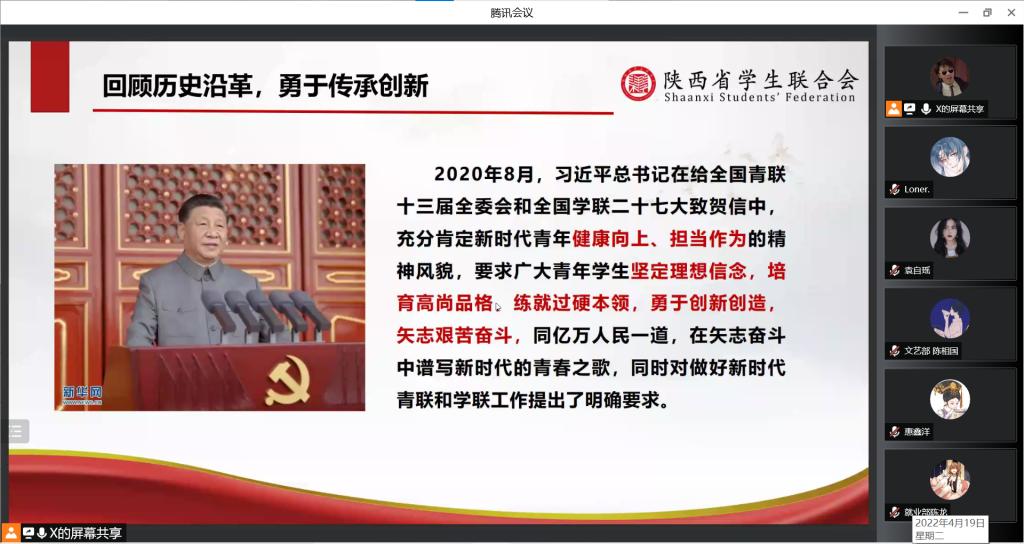 2022年4月19日晚19点30分,Beat365唯一官方网站于线上召开2022年春季学期学生骨干集体培训会议,Beat365唯一官方网站团总支书记、辅导员张岩和全体团学干部参加了本次会议,会议由许高博主持。