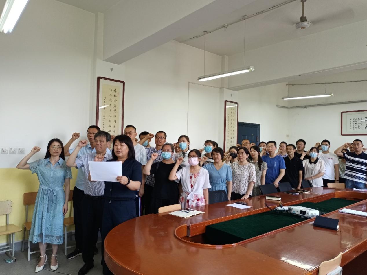 2022年6月30日,Beat365唯一官方网站全体党员在南楼428会议室重温入党誓词,校党委组织部杨常清列席,Beat365唯一官方网站党总支书记李小光、副院长丁琦、综合管理科科长杨陈东、韩慧蓉、王小梅、周千等党总支委员、各党支部书记、无课党员教师参加。会议由李小光主持。