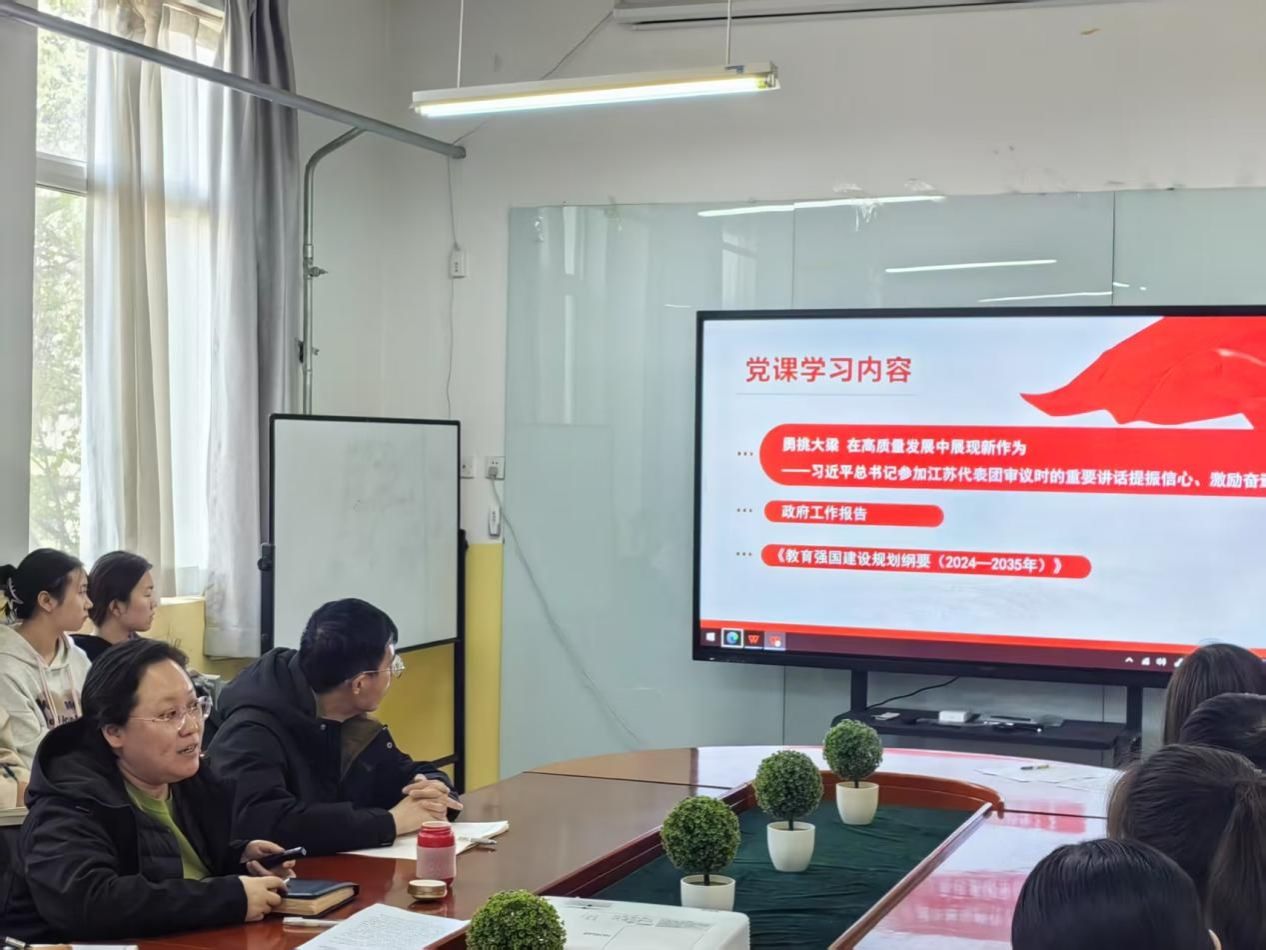 第一议题李扬首先领学了习近平总书记参加江苏代表团审议时的重要讲话。随后围绕“学习2025年全国两会精神”主题,结合《教育强国建设规划纲要(2024—2035年)》讲授专题党课,深入解读了两会报告中的重点内容,包括国家经济发展的新目标、社会民生保障的新举措以及教育改革的新方向,强调学生党员应在专业学习和未来工作中践行两会精神,为中国式现代化贡献力量。