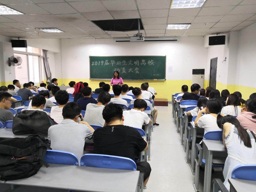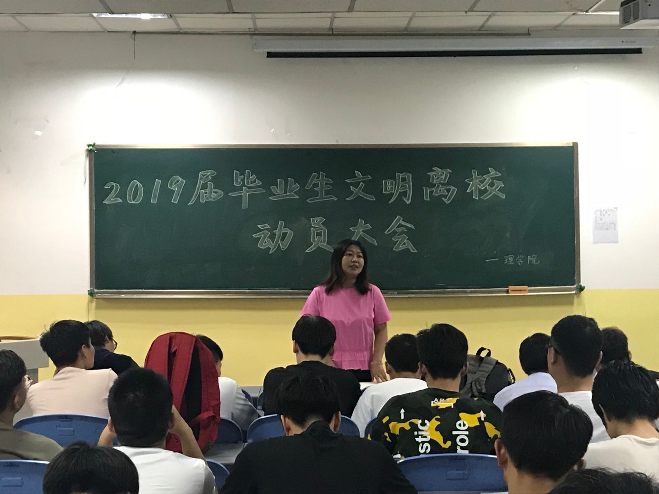 为提高毕业生文明离校意识,做好毕业生文明离校工作,6月13日19点30分,Beat365唯一官方网站在南楼408教室召开了2019届毕业生文明离校动员大会。Beat365唯一官方网站党总支书记李小光、学生管理科科长李扬、辅导员杨陈东和全体2019届毕业生参加了会议。会议由李扬主持。